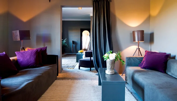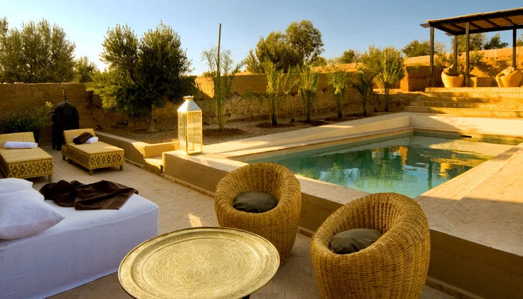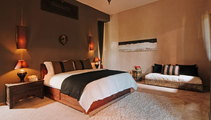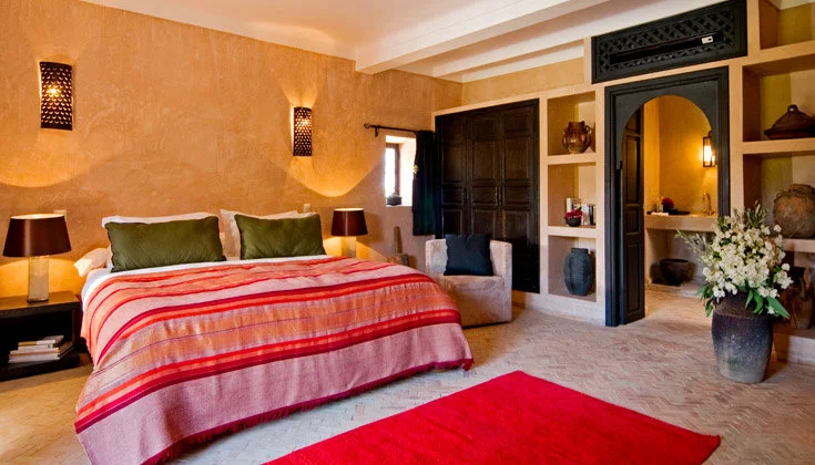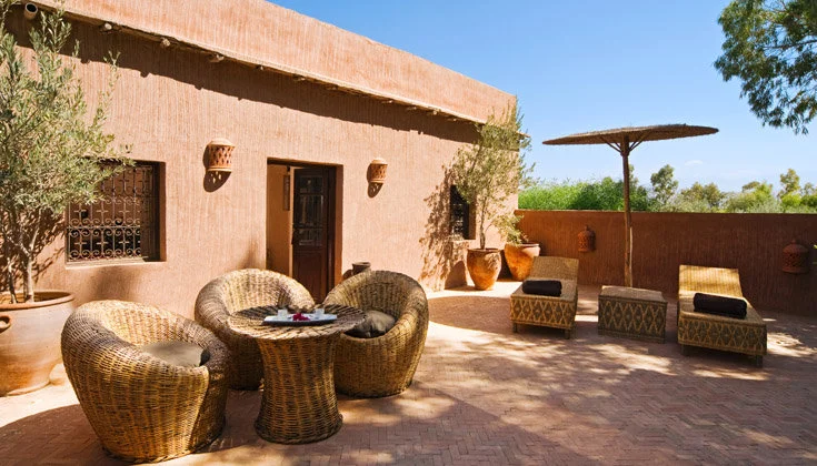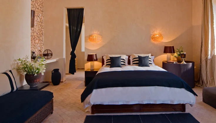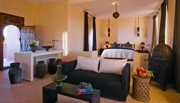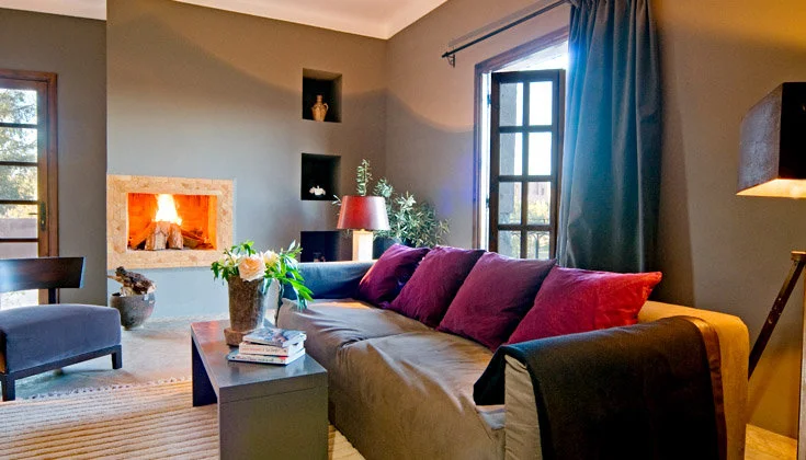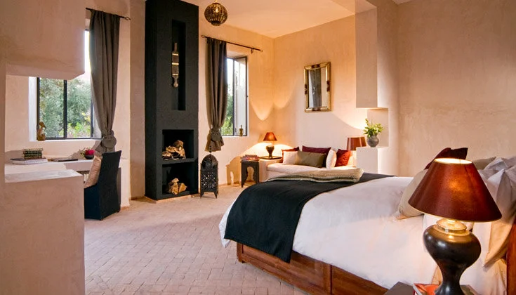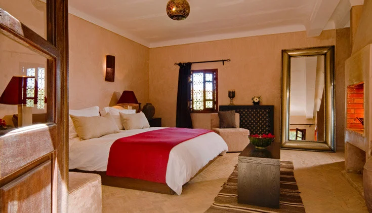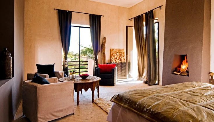Located on the first floor of the Old Farmhouse, our two Farmhouse Suites each has its own large furnished roof terrace looking onto the Atlas mountains. The bedrooms have an open fire and seating area. En-suite shower room in ‘tadelakt’, with traditional copper fittings.